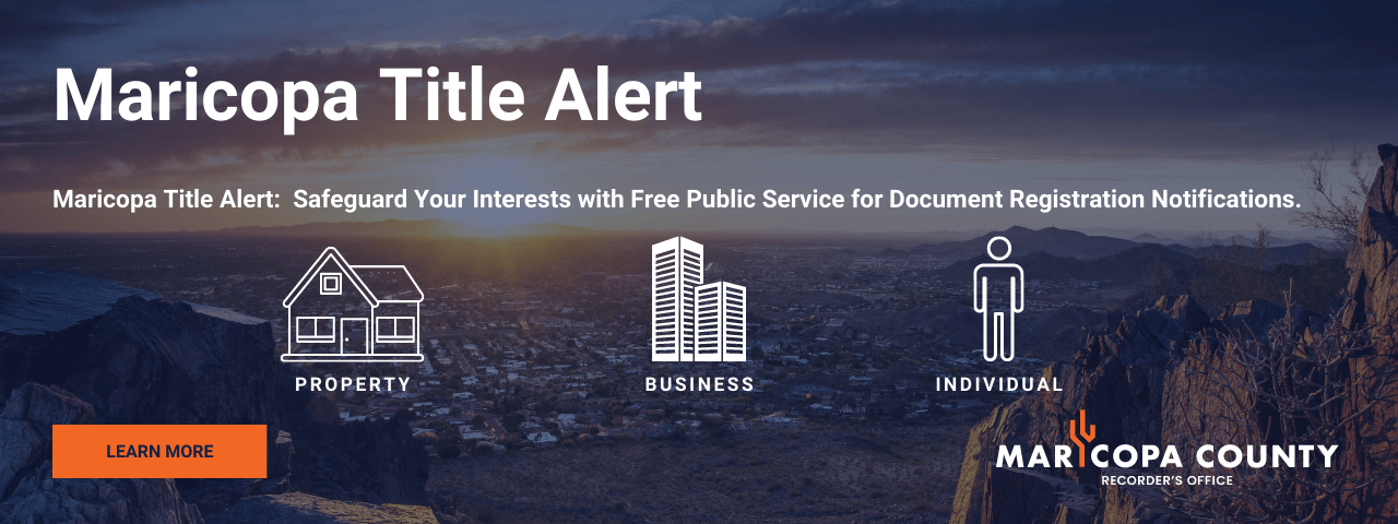Sign up promptly — If you own a home now or will soon, register your name and any business/entity under which you hold property with Maricopa Title Alert.